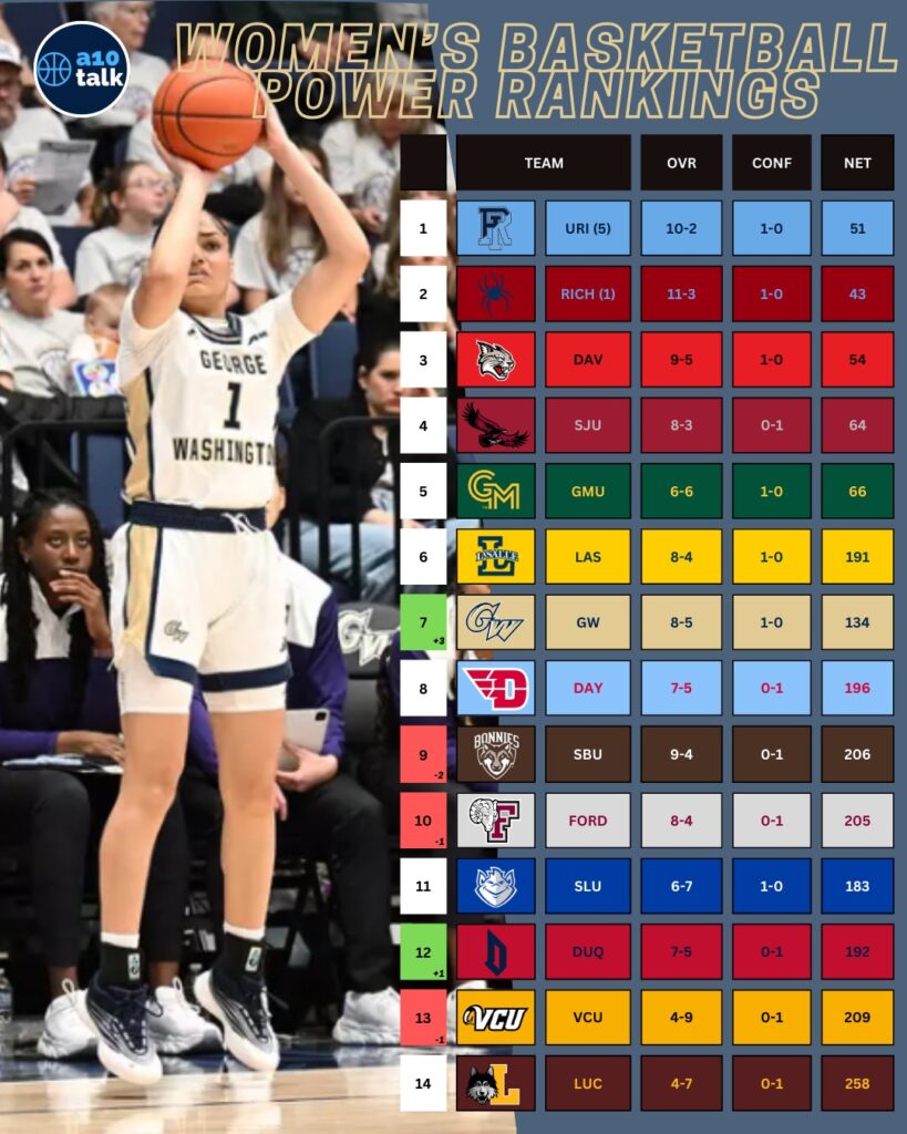 Non-conference play is nearly in the rear-view, and conference play is just on the horizon! Rhode Island continues to hold the fort atop the rankings after completing their best non-conference run in program history! Richmond is close behind picking up another first place vote this week, followed by the usual suspects in spots 3-5. GW moves up to 7th this week, as the Revolutionaries are riding a 6-game win streak, their first such stretch since 2017. We have a quiet week ahead with only a small handful of games after the holiday break before we kick things into gear next week with the main stretch of conference play! Here’s how things shake up this week.
